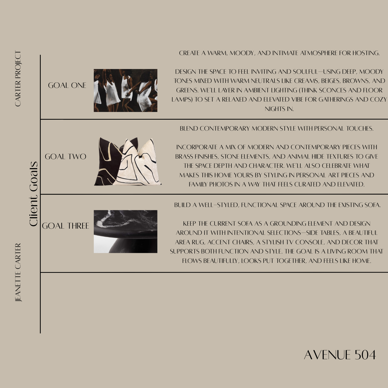 Here’s a quick recap of the goals we discussed for your space — what you want it to feel like, how you plan to use it, and the overall vibe we’re aiming for. Take a moment to review and let me know if there’s anything you’d like to add or adjust!