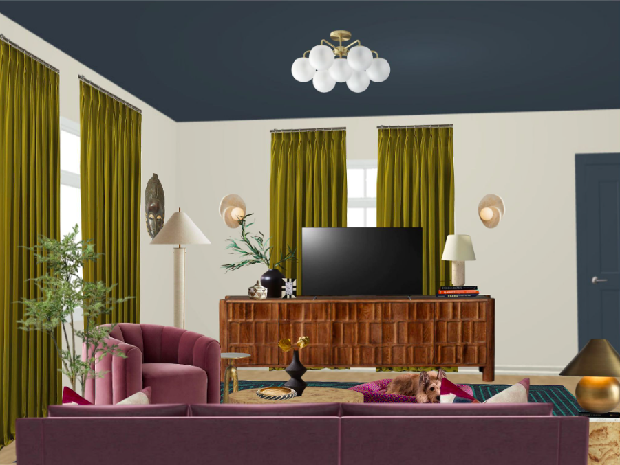 This concept leans into a cozy yet functional layout while also creating a subtle sense of entry, since the living room sits right at the front of the home. For this version, the walls are painted in Benjamin Moore’s Intrigue with a crisp white ceiling. The color is both warm and airy, pairing beautifully with the existing teals, blues, lavender, rose, and the rust tone in the hallway.