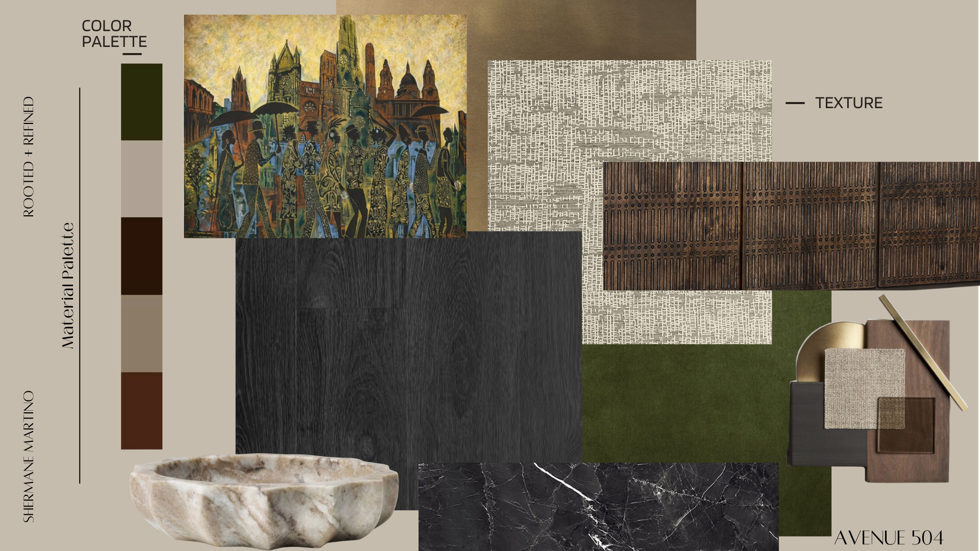 Here’s a collection of colors, fabrics, finishes, and textures for your project. This helps set the tone and visual foundation for everything.