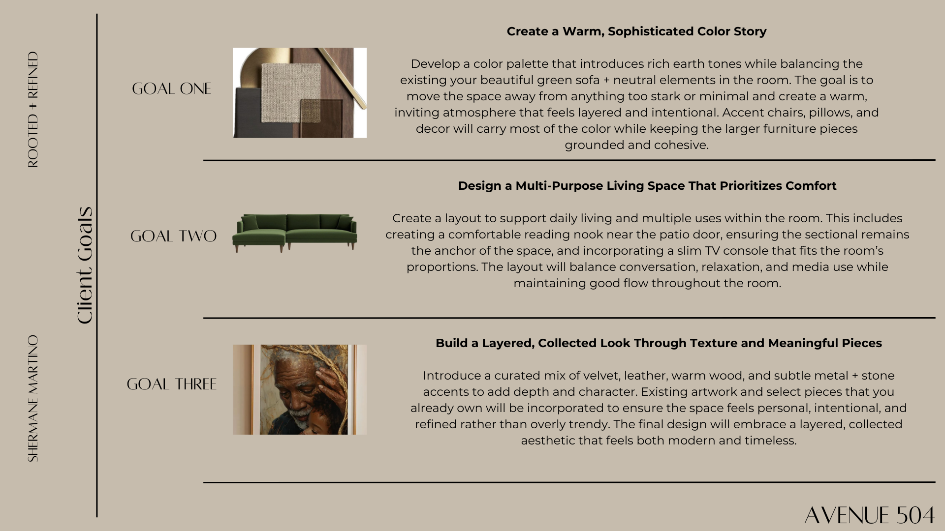 Here’s a quick recap of the goals for your space—how you want it to feel, how you plan to use it, and the overall vibe we’re aiming for. These are based on what we discussed together along with the information you shared in your project questionnaire. Take a moment to review and let me know if there’s anything you’d like to adjust or add.