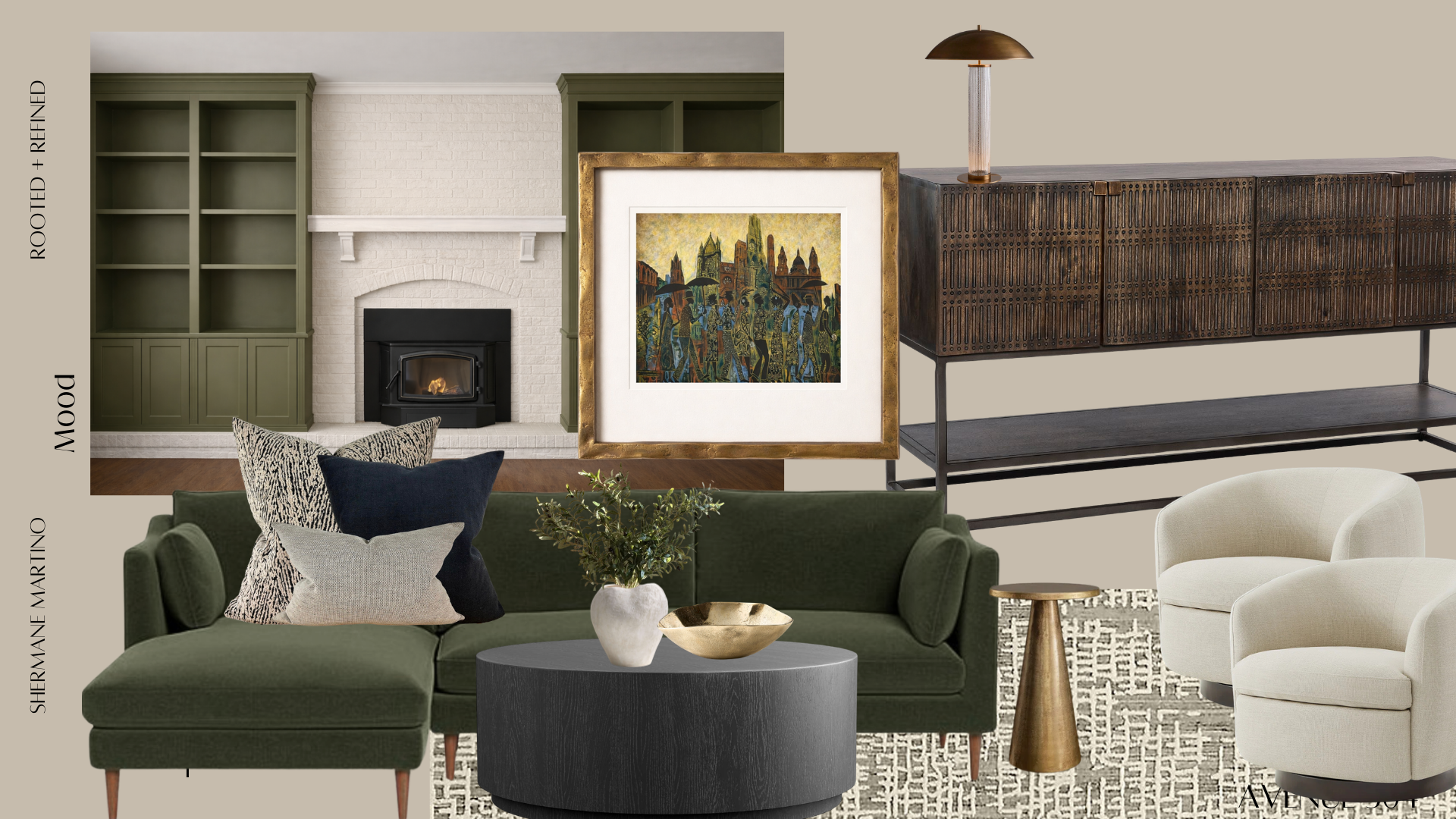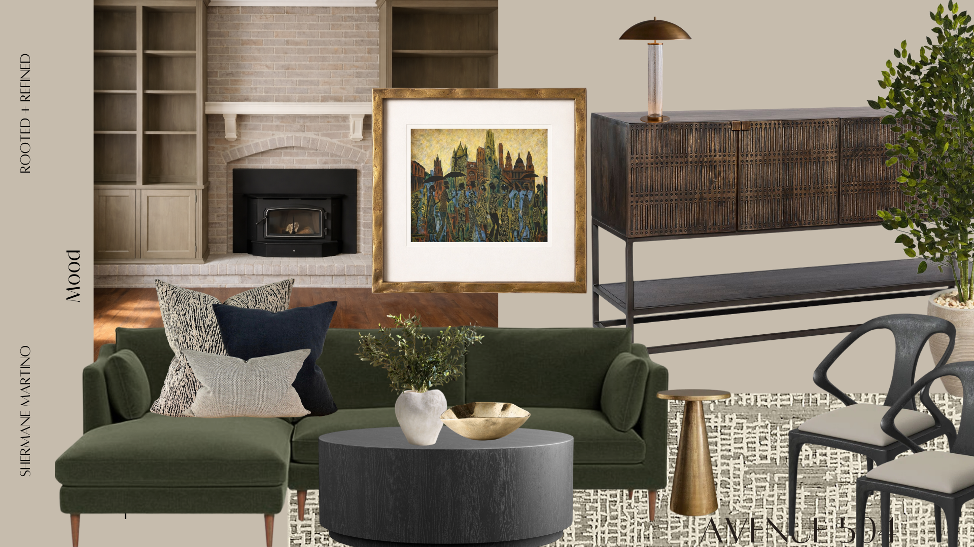 This living room will be thoughtfully designed to feel warm, sophisticated, and deeply inviting while supporting the way the space is used every day. Drawing inspiration from rich earth tones and deep greens, the design will introduce a layered color story that complements the existing architecture while adding depth and personality. Soft neutrals will provide balance while carefully selected accent pieces bring in warmth and visual interest.