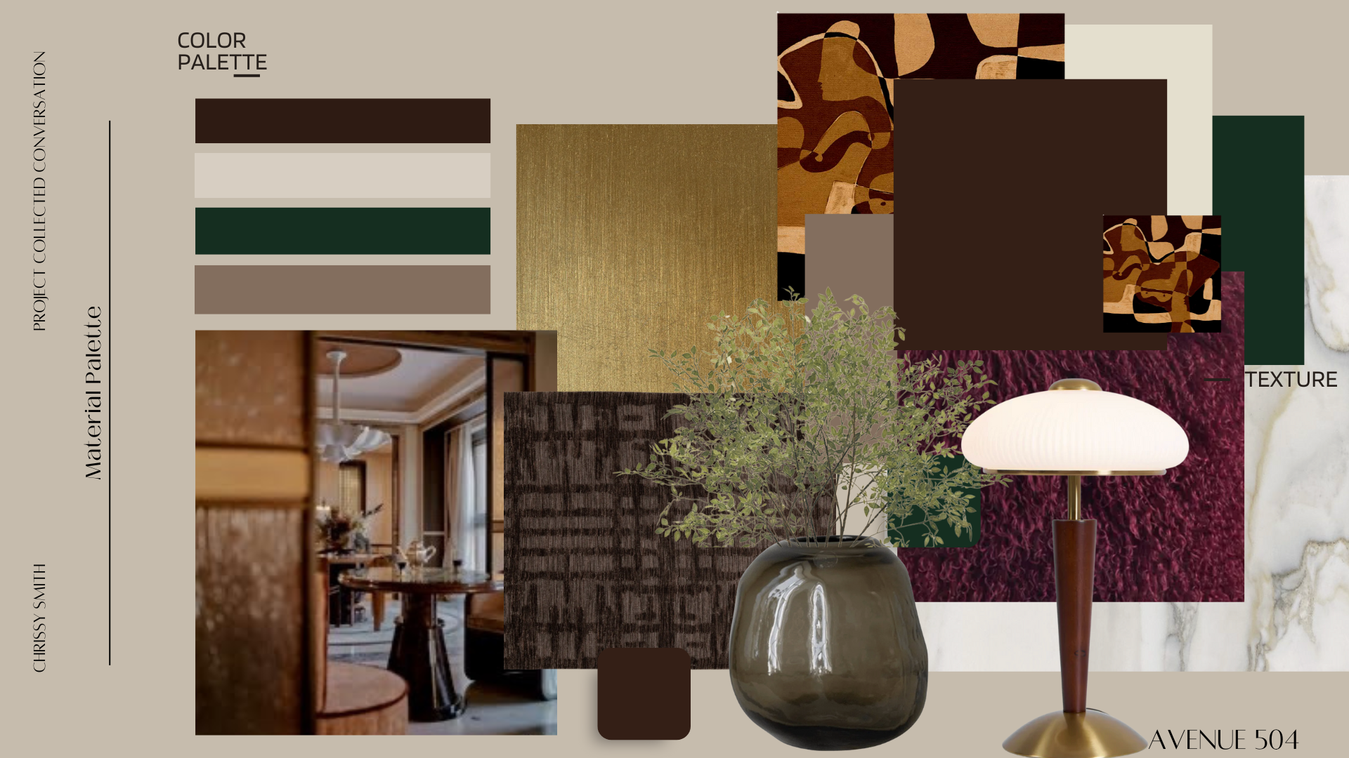 Here’s a collection of colors, fabrics, finishes, and textures I’m considering for your project. This helps set the tone and visual foundation for everything.
