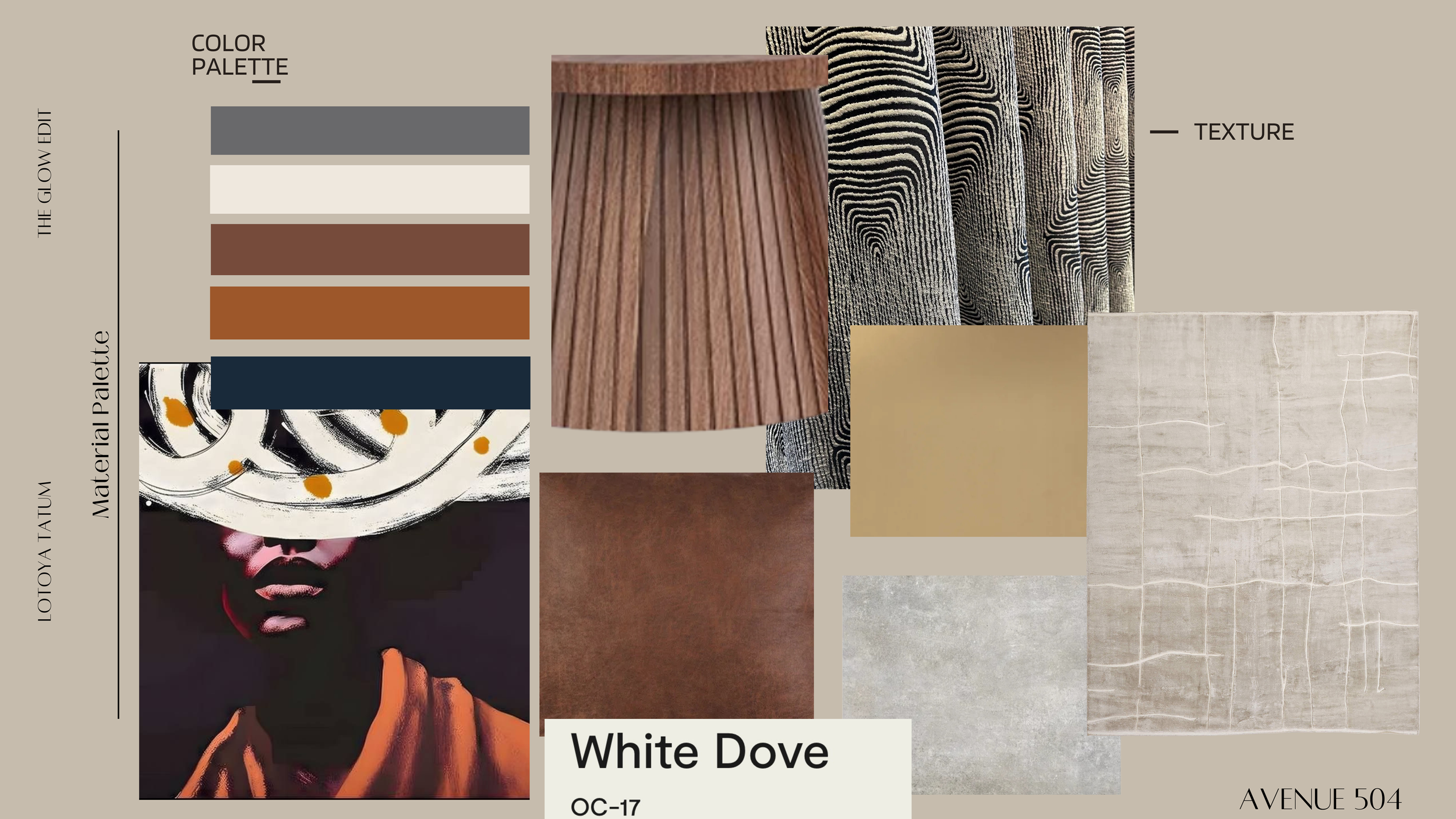 Here’s a collection of colors, fabrics, finishes, and textures I’m considering for your project. This helps set the tone and visual foundation for everything.